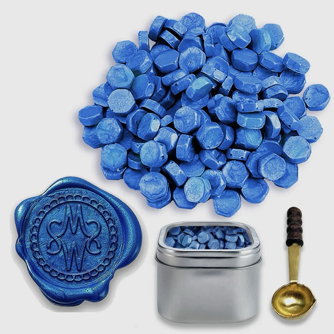 Sealing Wax Beads in Tin with Spoon. Ideal for melting in a spoon over a flame for individual impressions. This type of wax is easy, clean and affordable and completely flexible and mailable. Spoon holds enough wax to make one impression at a time. Each 2 ozs. Tin makes approximately 85 impressions.