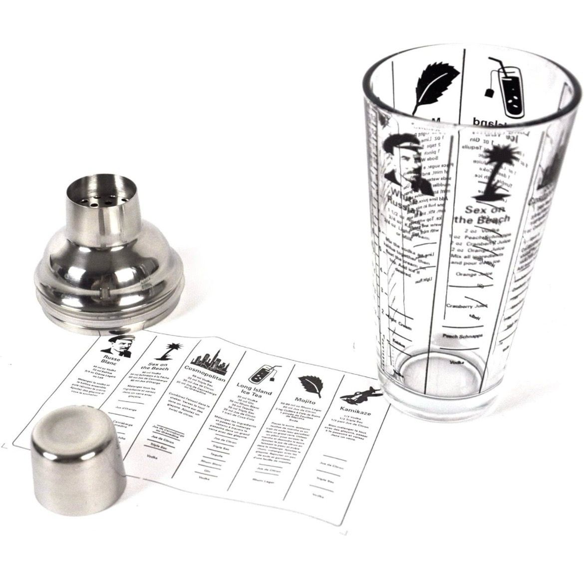 Fancy yourself a bartender? The Mix Master Cocktail Shaker has recipes and pour markings for six classic cocktails, making it easy to prepare perfect drinks. Includes recipes for: White Russian, Sex on the Beach, Cosmopolitan, Long Island Iced Tea, Mojito and Kamikaze. Capacity of 16 oz.