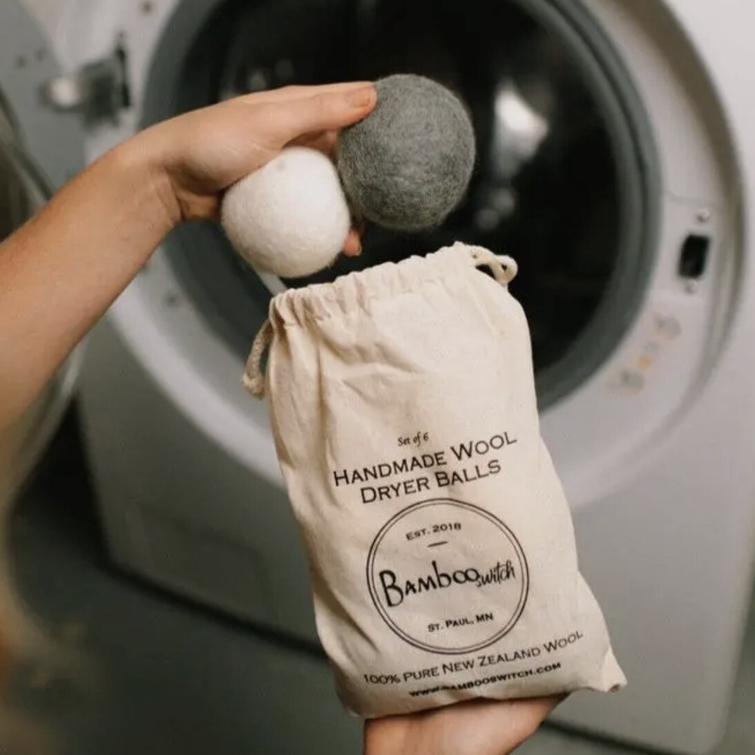 Set of 6 Dryer Balls with Organic Cotton Travel Bag Place up to 6 dryer balls in your dryer to decrease wrinkles, eliminate static, and naturally soften clothes. Dryer balls separate the clothes as they tumble, increasing air flow and decreasing drying time. Add a few drops of essential oils to each bag for an added scent! ~~~~ Dimensions: 8" height 6" length 2.5" width ~~~~ Ideal for: Zero waste/refill stores, gift stores, salons, spas, laundromats, cleaning companies, hospitality companies, realtors, Co- Ops, housewarming gifts, college send offs and so much more!
